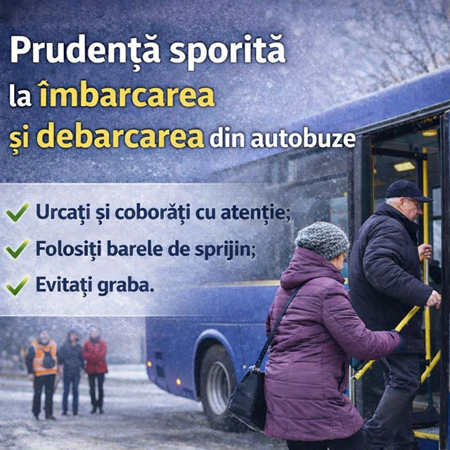 Î.M. „Parcul Urban de Autobuze” îndeamnă călătorii să manifeste prudență sporită la îmbarcarea și debarcarea din autobuze, în contextul condițiilor meteo nefavorabile.