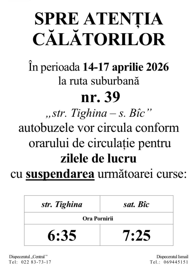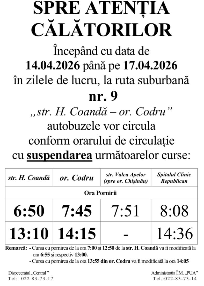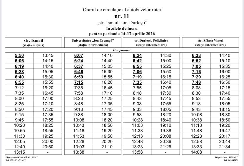 Pentru informații suplimentare despre circulația unei rute sau alteia, puteți apela dispeceratul PUA: 022 837 317.