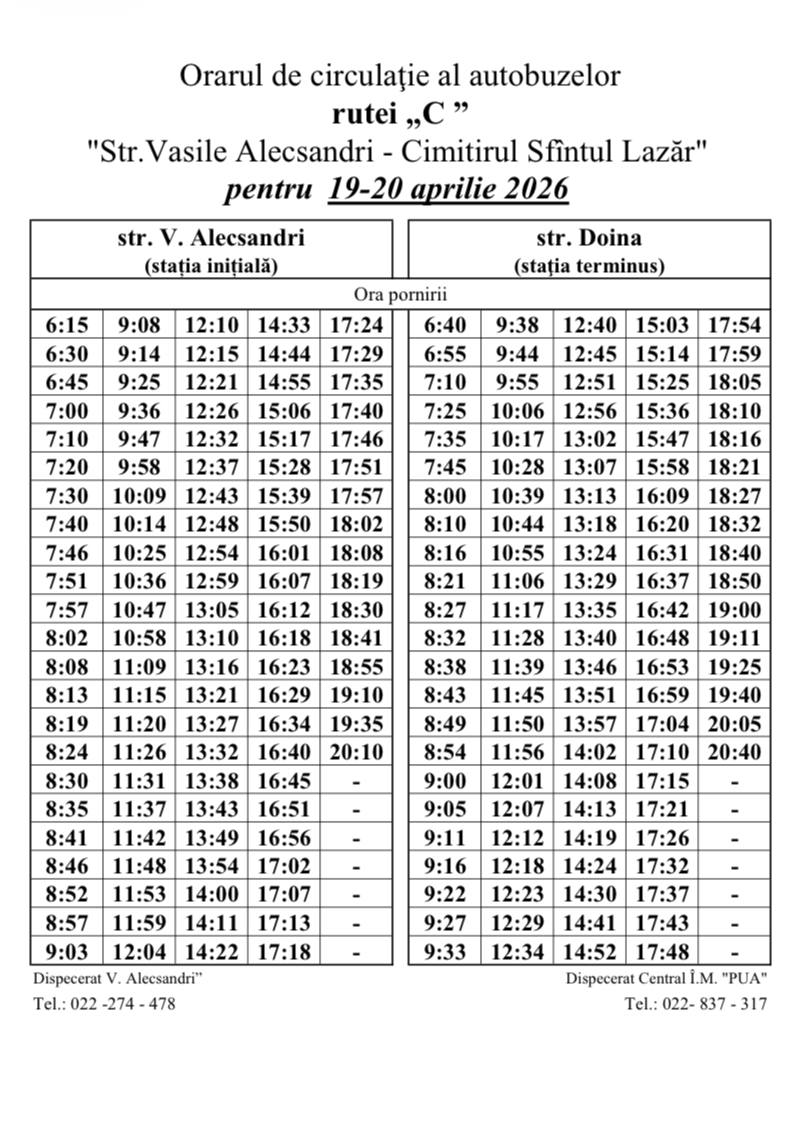 În zilele de 19 și 20 aprilie, municipalitatea va asigura circulația transportului public în regim special, pentru a facilita deplasarea cetățenilor către cimitire, în special spre Cimitirul „Sfântul Lazăr”.